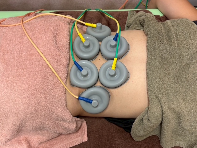 当院では、この低周波治療機器を筋肉や体の改善、手技治療効果を上げる補佐的な役割と痛めた個所を含めた腰を支える筋肉のケアのために行う施術です。