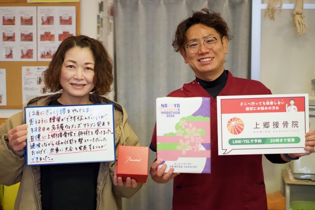 12月にギックリ腰をやってしまい、思うように練習ができず悩んでいましたが、上郷接骨院で施術を受けながら身体の状態を整えていただいたおかげで、無事に名古屋ウィメンズマラソンを完走することができました。